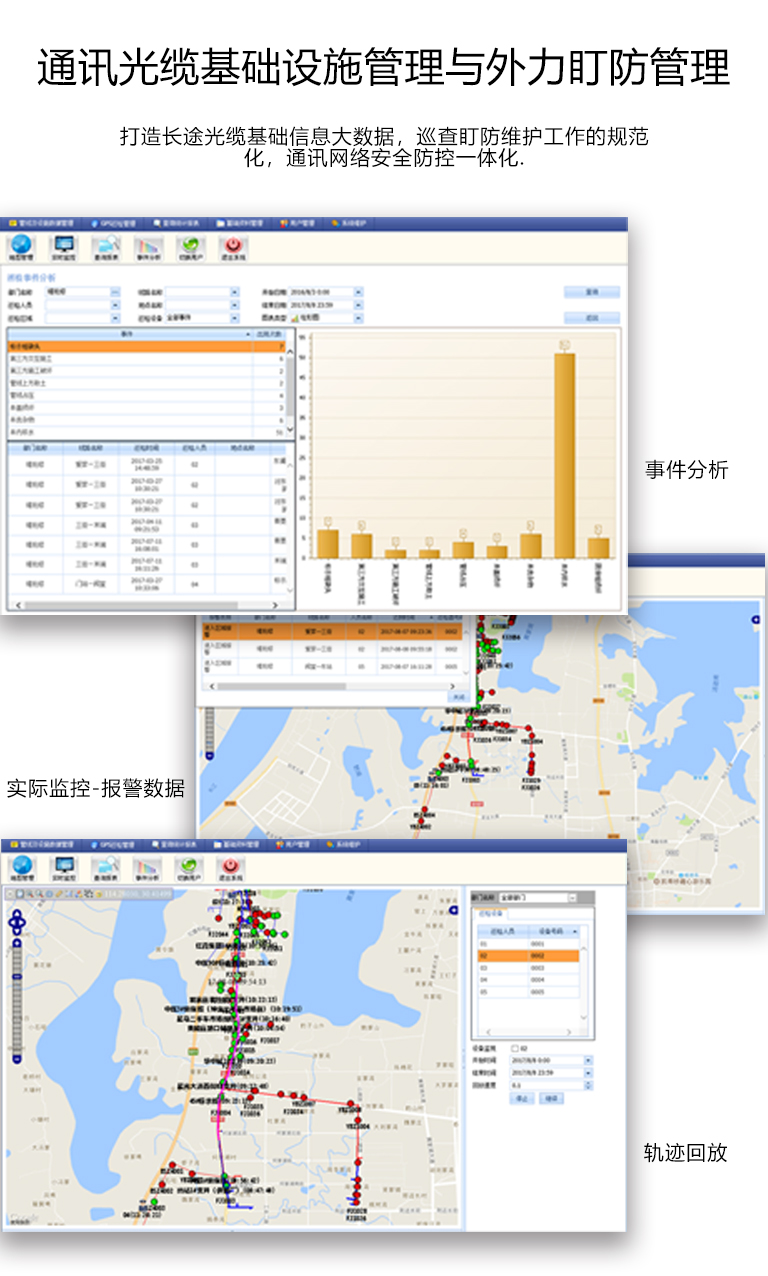 打造長(zhǎng)途光纜基礎(chǔ)信息大數(shù)據(jù),巡查盯防維護(hù)工作的規(guī)范化,通訊網(wǎng)絡(luò)安全防控一體化。
